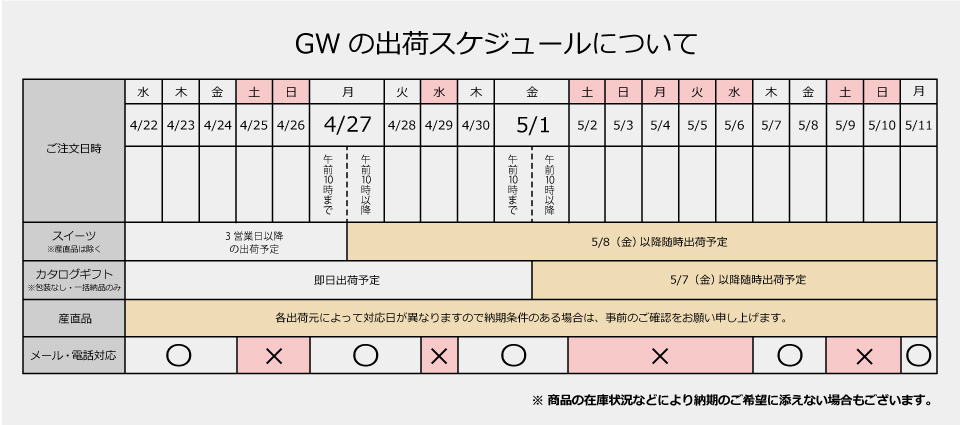 GW(ゴールデンウィーク)出荷スケジュールのご案内