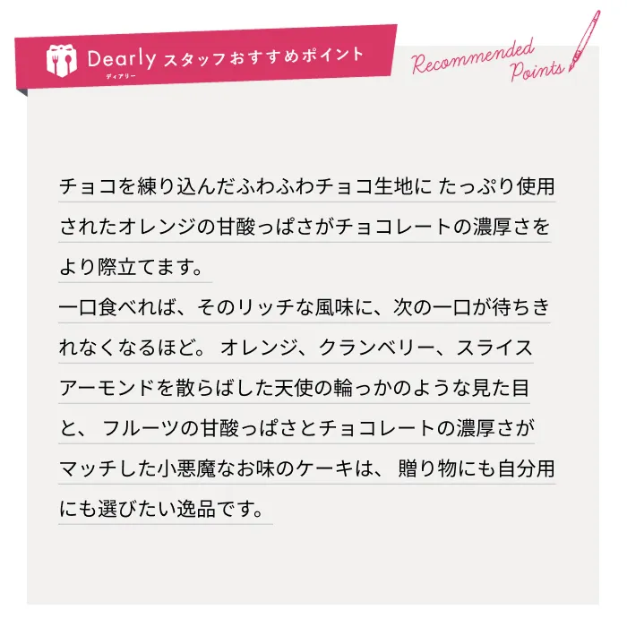 フルーツとナッツを散りばめたフォークが進む「小悪魔」ケーキ チョコを練り込んだふわふわチョコ生地に たっぷり使用されたオレンジの甘酸っぱさがチョコレートの濃厚さをより際立てます。 一口食べれば、そのリッチな風味に、次の一口が待ちきれなくなるほど。 オレンジ、クランベリー、スライスアーモンドを散らばした天使の輪っかのような見た目と、 フルーツの甘酸っぱさとチョコレートの濃厚さがマッチした小悪魔なお味のケーキは、 贈り物にも自分用にも選びたい逸品です。 「本当においしいフルーツを食べてもらいたい。」 そんな思いから生まれたのが、フルーツギフト&カフェ「ホシフルーツ」です。店内にはいつも、中国地方を中心に近隣の地域から取り揃えた旬の果物がずらり。市場に40年通い続けるフルーツの目利きが、季節ごとに旬のフルーツを厳選しています。甘い香りが漂うフルーツ売り場に併設されたスイーツ工房では、毎日、「食べ頃」のフルーツのおいしさをまるごと使ったスイーツを、その場でつくっています。 商品一覧をみる