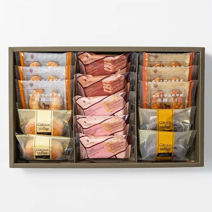 商品内容 馬蹄パイ(キャラメル・シュガーバター)・ミルフイユ(フランボワーズ)×各3個、ミルフイユ(キャラメルラテ)・スフレ(芳醇フロマージュ・濃厚ショコラ)×各2個