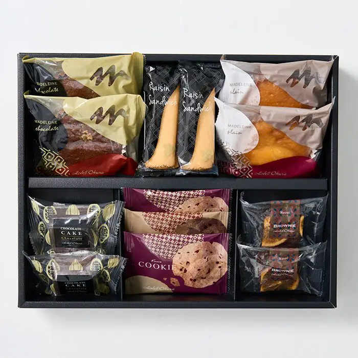 商品内容 ブラウニーネーブル・レーズンサンド・マドレーヌ(プレーン・チョコ)・チョコレートケーキ・レーズンクッキー×各2個、チョコチップクッキー×1個
