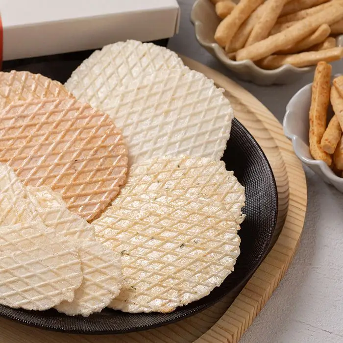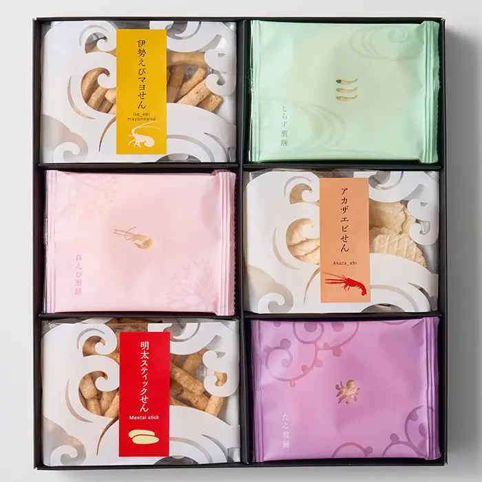 濃厚な旨味と繊細なくちどけが特徴の、極薄焼き煎餅です。人気の白えび煎餅・たこ煎餅・しらす煎餅に加え、スティックタイプの伊勢えびマヨせんと明太スティックせん、小丸タイプのアカザエビせんがミックスされたギフトセットです。