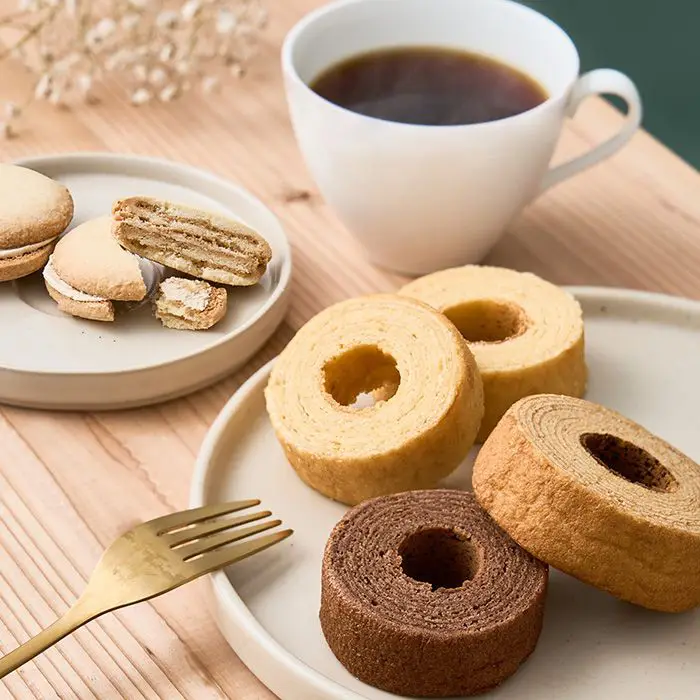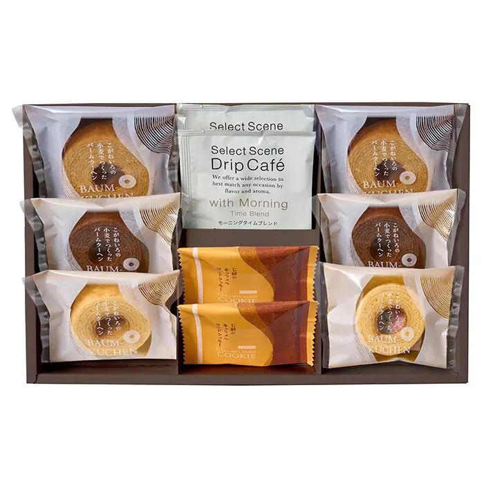 商品内容 ふんわりバームクーヘン(ミルク・ココア・黒糖×各2個)、七層のキャラメルサンドクッキー×2個、三喜屋珈琲のレギュラーコーヒー×2袋