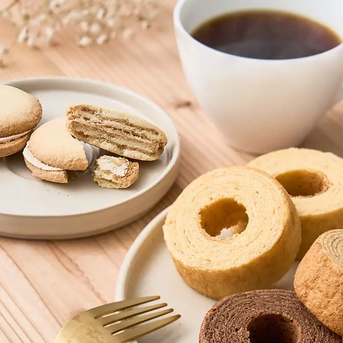 商品内容 ふんわりバームクーヘン(ミルク・ココア×各4個、黒糖×3個)、七層のキャラメルサンドクッキー×4個、三喜屋珈琲のレギュラーコーヒー×3袋