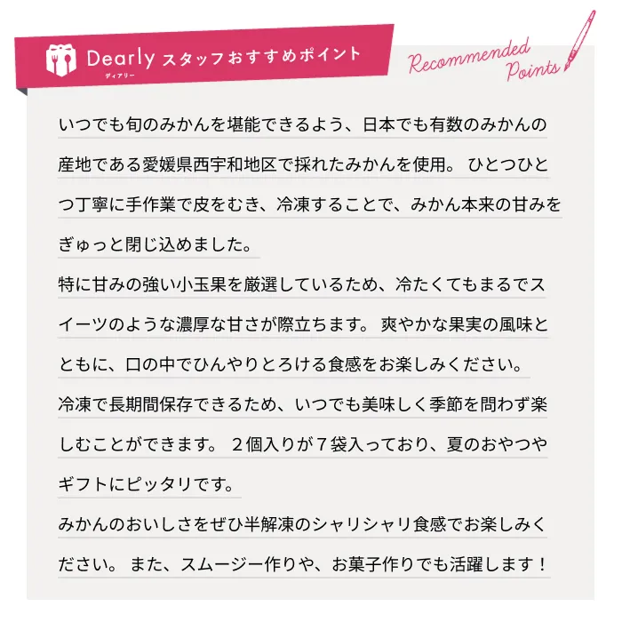 まるで果物のシャーベット!いつでも旬なみかんをどうぞ! いつでも旬のみかんを堪能できるよう、日本でも有数のみかんの産地である愛媛県西宇和地区で採れたみかんを使用。 ひとつひとつ丁寧に手作業で皮をむき、冷凍することで、みかん本来の甘みをぎゅっと閉じ込めました。 特に甘みの強い小玉果を厳選しているため、冷たくてもまるでスイーツのような濃厚な甘さが際立ちます。 爽やかな果実の風味とともに、口の中でひんやりとろける食感をお楽しみください。 冷凍で長期間保存できるため、いつでも美味しく季節を問わず楽しむことができます。 2個入りが7袋入っており、夏のおやつやギフトにピッタリです。 みかんのおいしさをぜひ半解凍のシャリシャリ食感でお楽しみください。 また、スムージー作りや、お菓子作りでも活躍します! 「本当においしいフルーツを食べてもらいたい。」 そんな思いから生まれたのが、フルーツギフト&カフェ「ホシフルーツ」です。店内にはいつも、中国地方を中心に近隣の地域から取り揃えた旬の果物がずらり。市場に40年通い続けるフルーツの目利きが、季節ごとに旬のフルーツを厳選しています。甘い香りが漂うフルーツ売り場に併設されたスイーツ工房では、毎日、「食べ頃」のフルーツのおいしさをまるごと使ったスイーツを、その場でつくっています。 商品一覧をみる