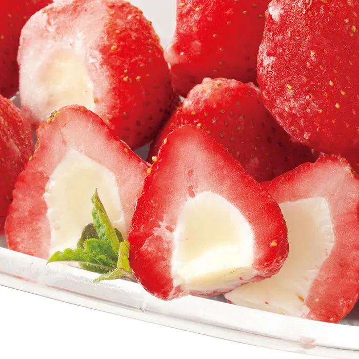 苺の中心を丁寧にくり抜いて、相性のよい練乳味のアイスを絞り込みました。苺の酸味とコクのあるアイスの甘みが織りなすハーモニーをお楽しみください。