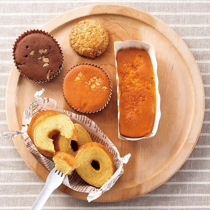 商品内容 オートミールクッキー×3枚、マドレーヌ(プレーン)・マドレーヌ(チョコ)各3個、チーズスティック×2個、ミニバームクーヘン7個入×2袋