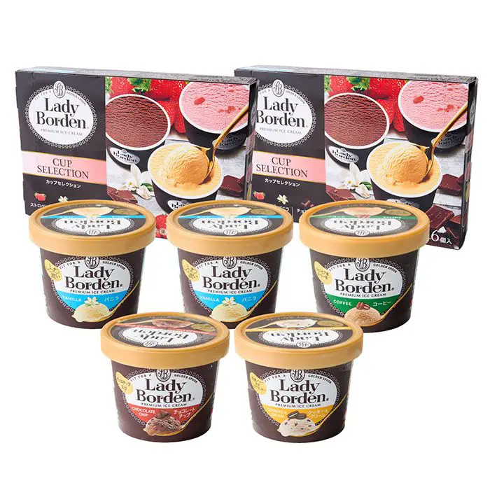商品内容 レディーボーデンミニカップバニラ120ml×2個、レディーボーデンミニカップチョコレートチップ120ml×1個、レディーボーデンミニカップコーヒー120ml×1個、レディーボーデンミニカップクッキー&クリーム120ml×1個、レディーボーデンマルチカップセレクション75ml×3種×2個×2
