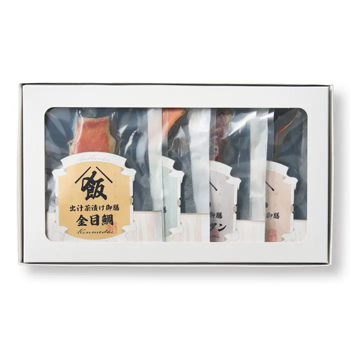 商品内容 金目鯛(金目鯛切身1切、だしつゆ10g、具材2g)・鮭(サケ切身1切、だしつゆ10g、具材2g)・厚切り牛タン(牛タン20g、だしつゆ10g、具材2g)・鰻(うなぎ15g、だしつゆ10g、具材2g)×各1袋