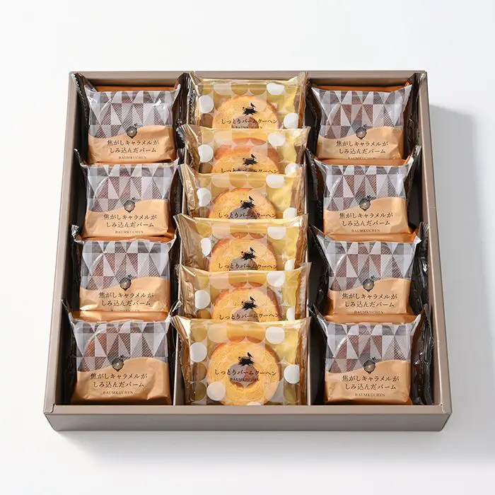 商品内容 焦がしキャラメルがしみ込んだバーム×8、しっとりバームクーヘン×6