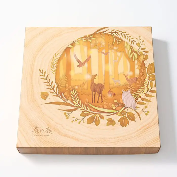非日常の森の庭で素朴なお菓子を味わう『森の庭』シリーズ。しっとりバームクーヘンにカラメルソースをまとわせ、砂糖をかけてさらに焼き上げた「焦がしキャラメルがしみ込んだバーム」と、「しっとりバームクーヘン」の2種を詰め合わせました。ひと手間かけた味わいをお楽しみください。木の年輪の奥に広がる不思議な森の世界に迷い込んだ小鹿が動物たちに出会って仲間をつくっていくストーリーをパッケージデザインに描きました。