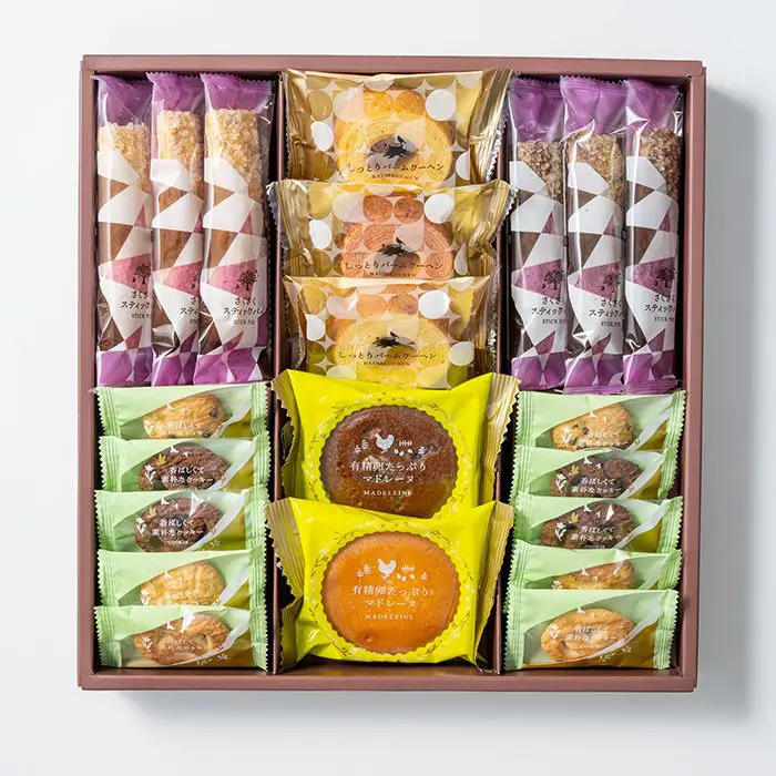 商品内容 しっとりバームクーヘン×2、しっとりバームクーヘン苺×1、有精卵たっぷりマドレーヌ(プレーン・ショコラ×各1)、香ばしくて素朴なクッキー(ショコラ×4、ミルク・チョコチップ・メープル×各2)、さくさくスティックパイ(メープル・ショコラ×各3) 合計21個