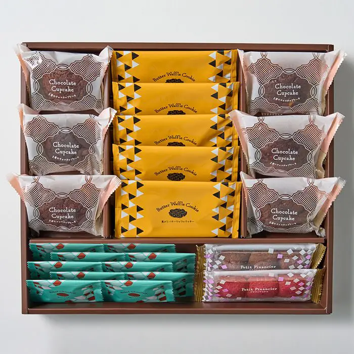 商品内容 2層のチョコカップケーキ×6個、焼きショコラ×10個、焦がしバターワッフルクッキー×5枚、プチフィナンシェ(ショコラ・フランボワーズ)×各1袋(3個入)