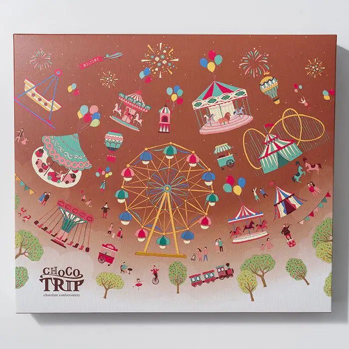 ふんわり2層のチョコカップケーキ、濃厚なチョコレートの風味が特徴の焼きショコラ、焦がしバター香るキャラメリゼされたワッフルクッキー、いろどりプチサイズのフィナンシェ。楽しさ詰まった、魅惑のお菓子たちで、食べあう人に笑顔の時間をプレゼントします。チョコをきっかけに魅惑の遊園地へトリップさせてくれる『CHOCOTRIP』からの贈り物。「CHOCOTRIP」雲に乗ってフワフワ移動する不思議な遊園地は、人々にとびきりのワクワクドキドキを届けます。パークのショーマンが差し出すチョコレートのお菓子をチケット代わりに、あなたを空飛ぶ不思議な遊園地へと連れて行ってくれます。そんな夢のような楽しい時間を過ごせるよう、ワクワク感たっぷりのお菓子を詰合せたブランドです。