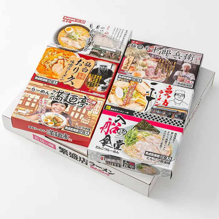商品内容 札幌「いちまる」味噌味・秋田「十郎兵衛」醤油味・仙台「おり久」辛みそ味・喜多方「一平」醤油味・広島「満麺亭」醤油味・博多「入船食堂」とんこつ味 各2食×1個(計12食セット)