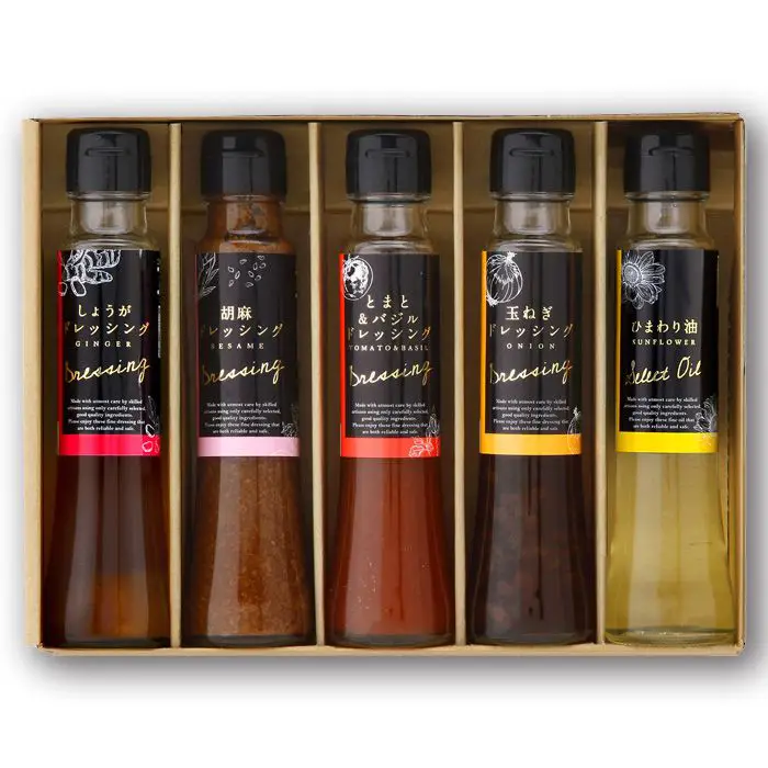 商品内容 しょうがドレッシング100ml、胡麻ドレッシング100ml、とまと&バジルドレッシング100ml、玉ねぎドレッシング100ml、ひまわり油90g×各1
