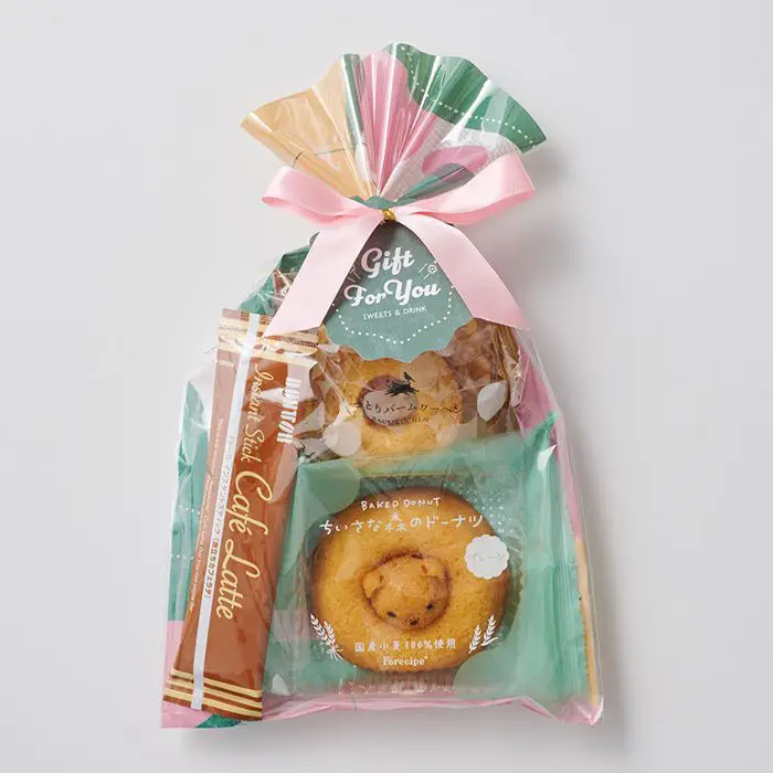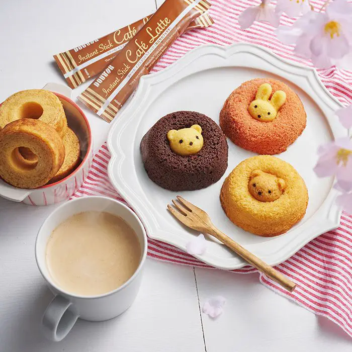ふんわり焼きドーナツの真ん中に小さなくまがひょっこり。しっとりバームクーヘンとドトールのカフェラテのプチギフトです。