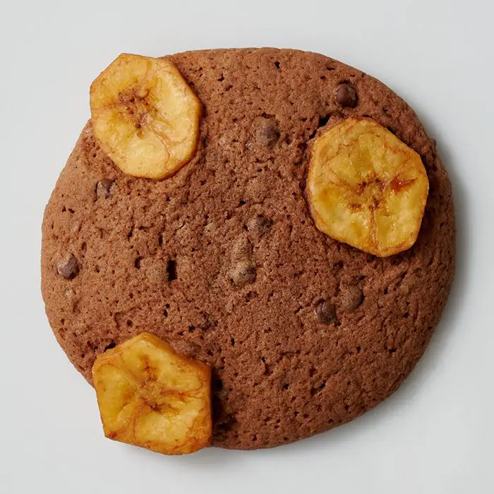 直径約8.5cm、しっとりほろほろ食感の大判クッキー。チョコレート生地にトッピングのバナナチップの食感が楽しい1枚。こどものように無邪気でいたい日にピッタリです。