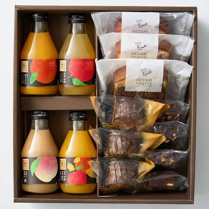 商品内容 ジュース(山口島そだち・青森林檎・山梨 和歌山桃・ミックスジュース(国産蜜柑・沖縄パイン・青森林檎))×各1本 各180ml、カップケーキ(オレンジ・マロン・パインココナッツ)×各1個、パウンドケーキ(オレンジピール×チョコ・ブルーベリー×クリームチーズ・いちご×アールグレイ)×各1個、ブラウニー(ネーブル・パイナップル・ドライフルーツ&ナッツ・ピスタチオ&アーモンド)×各1個