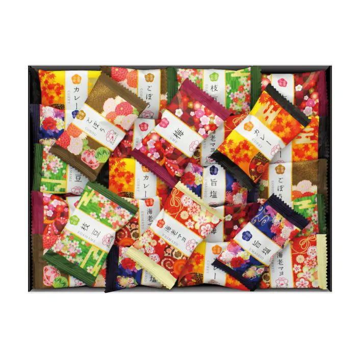 ふっくらサクサクのひとくちあられ。個性的な味と定番の味をベストバランスで詰合せました。缶ではなく箱にすることで廃棄の手間もなく置き場所もとりません。チャック付き袋でお手軽にいつでもおいしくいただけます。快適なライフスタイルにぴったりのおかきギフトです。