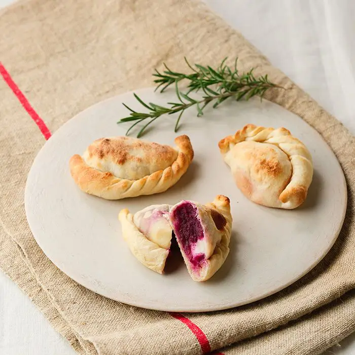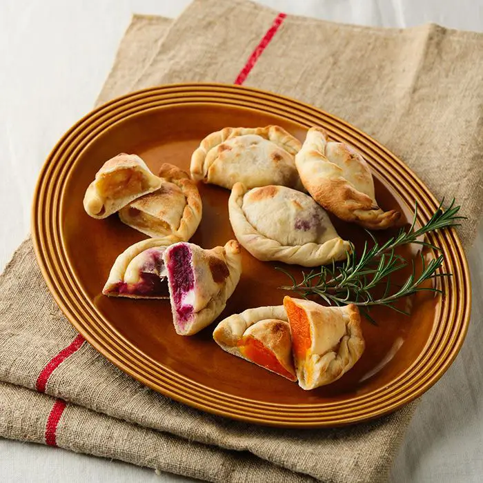 徳島を代表する鳴門金時をはじめ、色鮮やかな紫芋や濃厚な味わいの人参などの素材の持ち味を活かし、やさしい甘さのチーズクリームを加えて手包みで仕上げたカルツォーネピザ。300℃で一気に焼きあげて旨みを凝縮し、おいしさをそのままに-35℃で瞬間冷凍するため、電子レンジで温めるだけで作りたての味わいを楽しめる。
