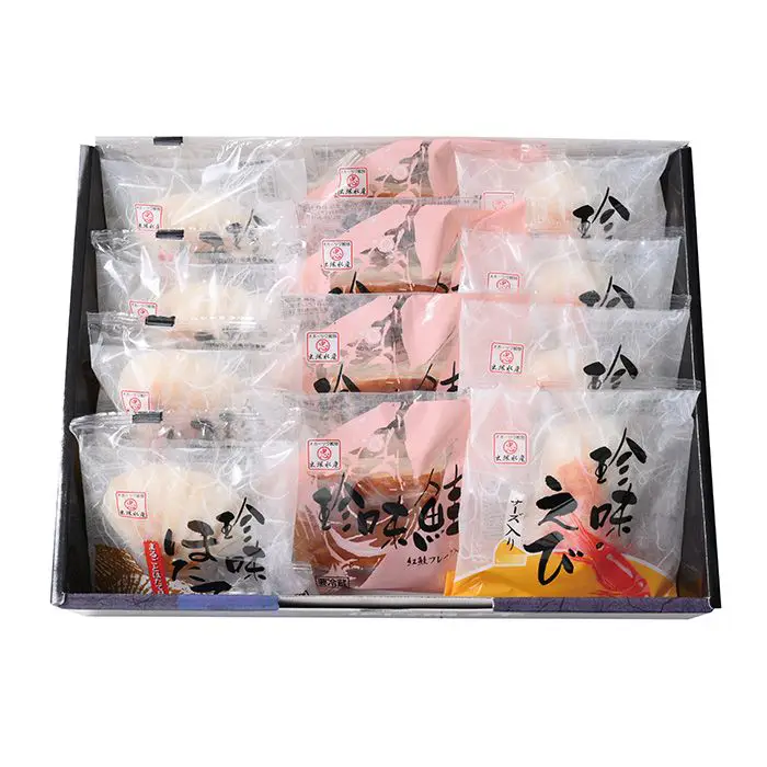 ほたて貝をかたどったかまぼこの中にオホーツク産の帆立貝柱がまるごと1個入った「ほたて」。2尾のえびがのった「えび」の中にはチーズが。鮭フレークをふんだんに使って表面を香ばしく焼き上げた「鮭」は、少し厚めにスライスして、わさび醤油やマヨネーズでどうぞ。大きめサイズで食べごたえ十分な3種の詰合せです。