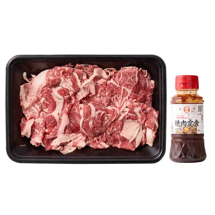 商品内容 国産こま切れ牛肉200g、赤丸焼肉定食のたれ185g