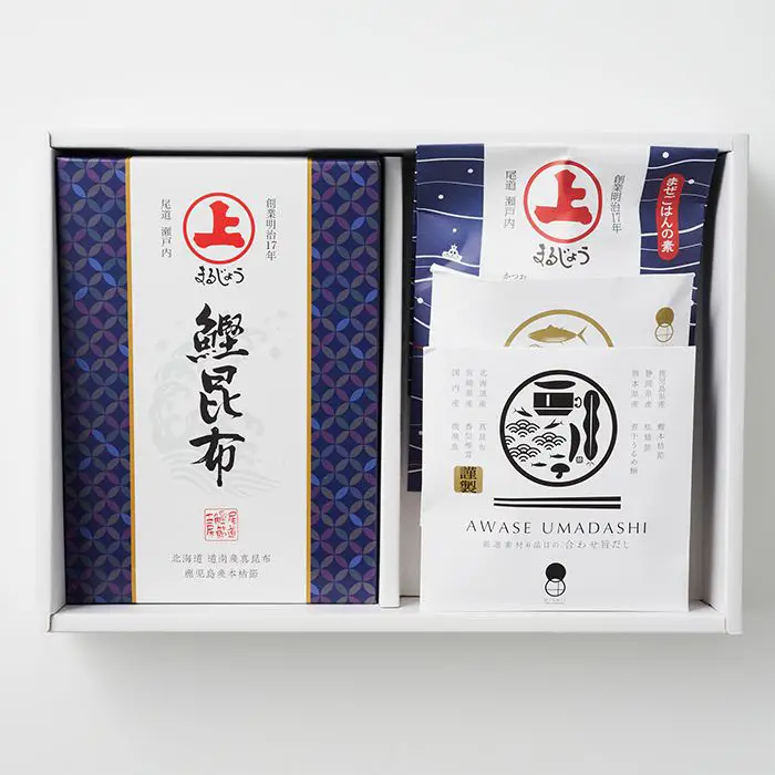 港町・尾道で創業し、140余年を迎えるまるじょうから鰹節ギフトセットをお届けします。ふわっと削った鰹節「花かつお」。鰹本枯節や枯鯖節など6つの素材を使っただしパック「合わせ旨だし」。本かつおに、にんじんやしいたけなどを加えた混ぜごはんの素「鰹ごはん」。昆布と本枯節をやわらかく炊き込んだ佃煮「鰹昆布」の詰合せです。