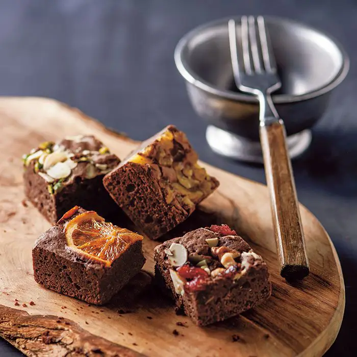 濃厚なチョコレートの生地に、香ばしいナッツや甘酸っぱいフルーツをトッピング。ピスタチオとアーモンド、ごろっとしたパイナップルやネーブル、たっぷりのドライフルーツとナッツ…。おいしさをぎゅっと詰め込んだキューブが、お口に小さなしあわせをお届けします。ナッツやドライフルーツをトッピングした、食べごたえ満点なブラウニーです。ふんわりとした食感に、ナッツの香ばしさやフルーツの甘い香りがたまらない、見栄えも味も贅沢なスイーツです。チョコとフルーツ存分に。選りすぐりのフルーツをふんだんに使ったギフトが評判のホシフルーツならでは。濃厚しっとりのブラウニーに、香ばしいナッツやドライフルーツを贅沢にトッピングしました。