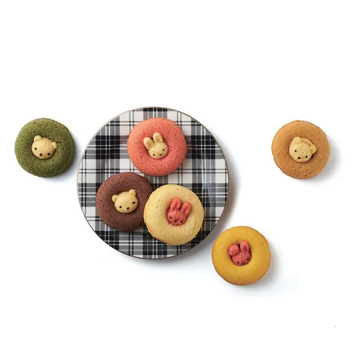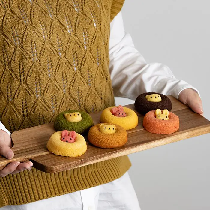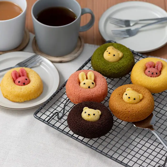 真ん中から動物たちがひょっこり顔を出した焼きドーナツ。その愛嬌のある見た目は、食べるのがもったいなくなるほど。かわいいボックスがギフトにもぴったりです。ドーナツのおうちでウサギさんとクマさんがまったり!?色とりどりな輪っかのまん中には、ウサギとクマの小さな焼ドーナツ。見た目のかわいさはもちろん、しっとり食感は女子をとりこにすること間違いなし!かわいい箱はプレゼントにもぴったりです。