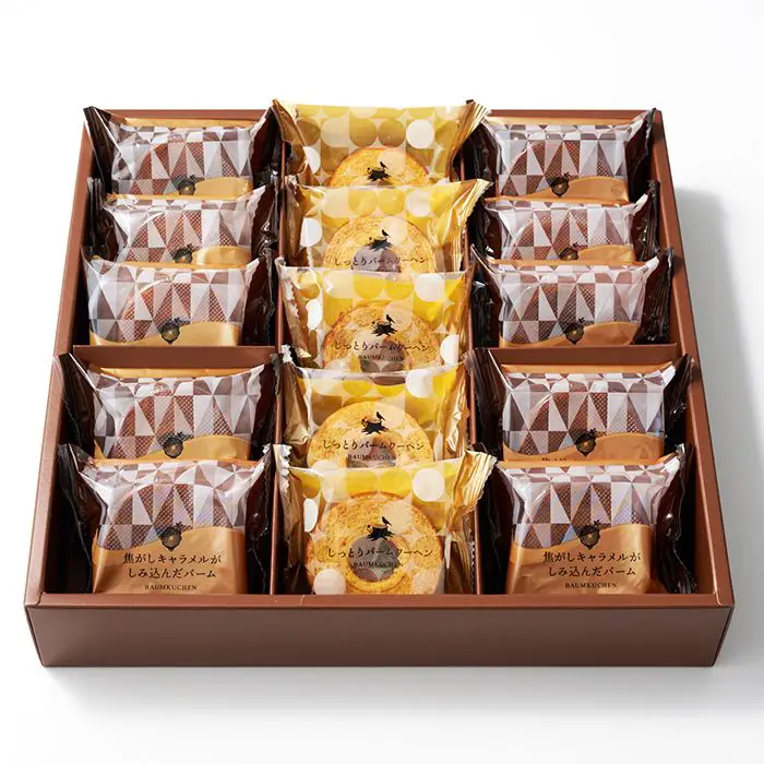 商品内容 焦がしキャラメルがしみ込んだバーム×10、しっとりバームクーヘン×5