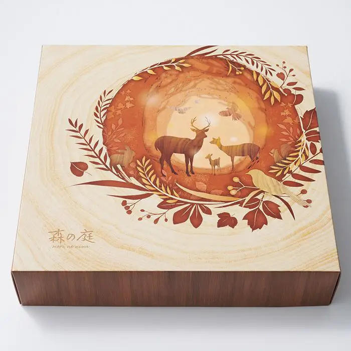 非日常の森の庭で素朴なお菓子を味わう『森の庭』シリーズ。しっとりバームクーヘンにカラメルソースをまとわせ、砂糖をかけてさらに焼き上げた「焦がしキャラメルがしみ込んだバーム」と、「しっとりバームクーヘン」の2種を詰め合わせました。ひと手間かけた味わいをお楽しみください。木の年輪の奥に広がる不思議な森の世界に迷い込んだ小鹿が動物たちに出会って家族をつくっていくストーリーをパッケージデザインに描きました。
